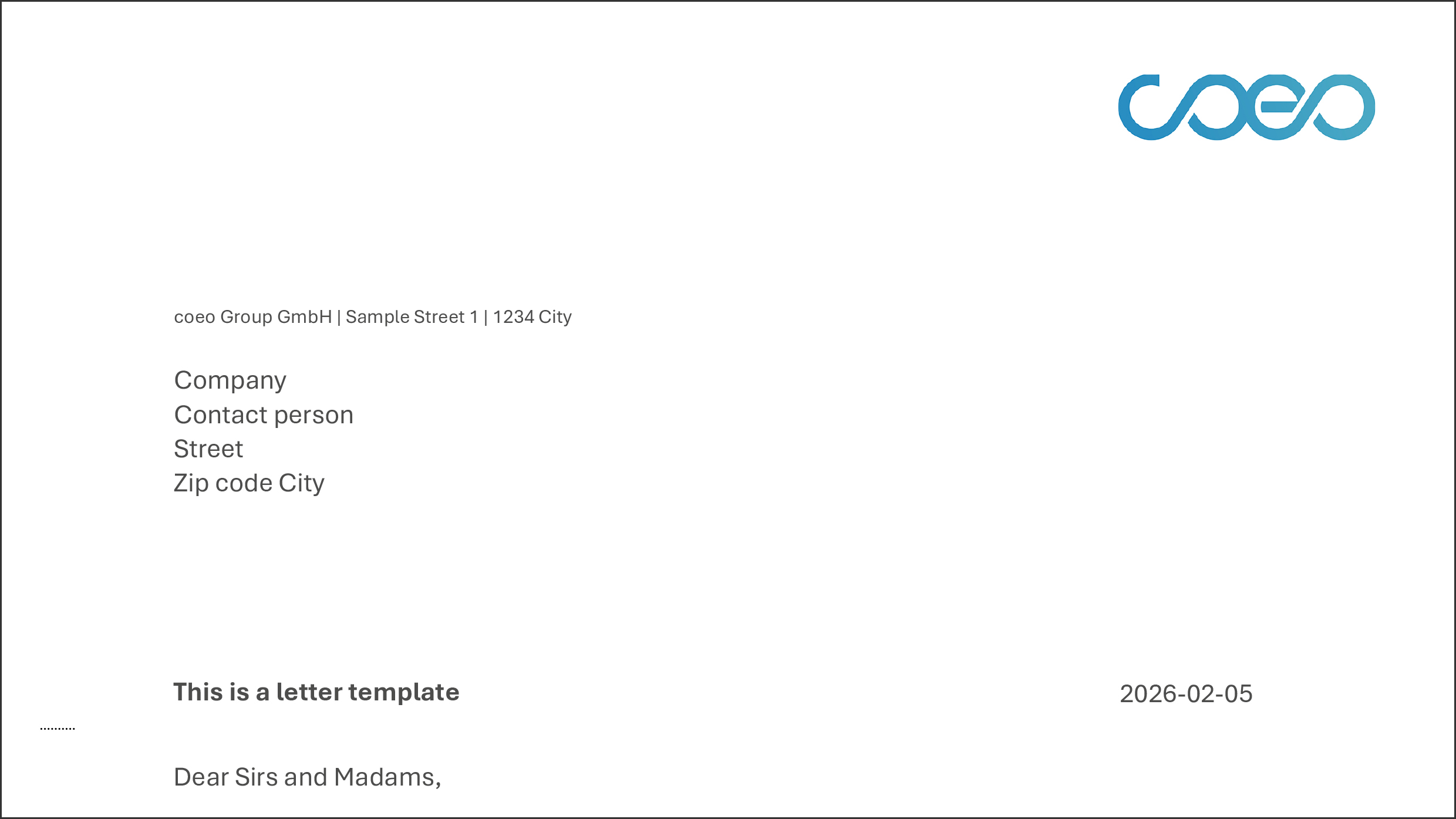 Brevmallen kombinerar ren design med vårt företags utseende och känsla. Den hjälper dig att skapa professionella brev som är visuellt anpassade till coeos varumärke – strukturerade, snygga och träffsäkra.
